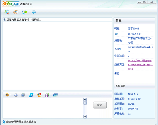 kf000在線客服系統(tǒng)客服端就彈出客服窗口,呼叫該訪客,等待訪客響應(yīng):