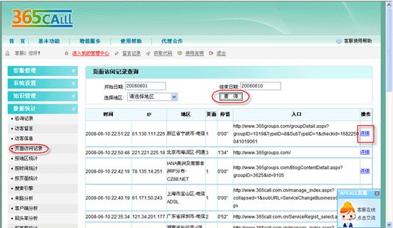 掌握真實有效的流量、咨詢量數(shù)據(jù),記錄流量和咨詢量數(shù)據(jù)及相互關(guān)系,為企業(yè)營銷提供參考數(shù)據(jù)。 頁面訪問記錄查詢: 登陸kf000在線客服系統(tǒng)網(wǎng)站,點擊“數(shù)據(jù)統(tǒng)計”->“頁面訪問記錄”,可選擇時間段,點擊“查詢”按鈕進(jìn)行查詢: