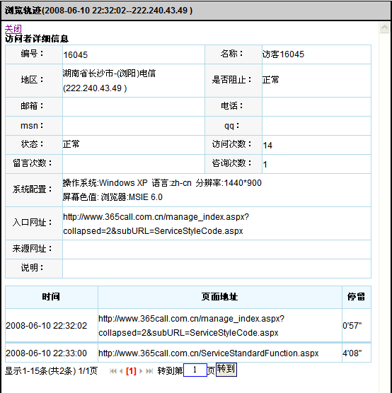 點擊上圖中某一條查詢結(jié)果的“詳細(xì)”操作,彈出該訪問者的詳細(xì)信息: