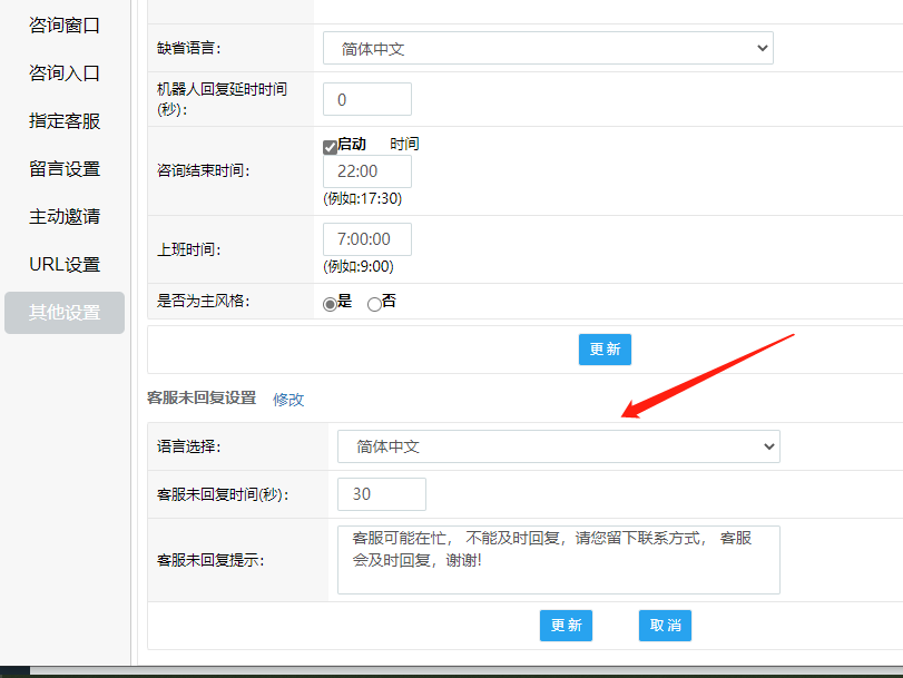 訪客可在客服休息時(shí)間或忙碌未及時(shí)回復(fù)時(shí)將自己的聯(lián)系方式留下,等待客服回呼解決問題,可在“系統(tǒng)設(shè)置-媒體對(duì)接-網(wǎng)頁(網(wǎng)站)-設(shè)置-咨詢?nèi)肟凇?/span>